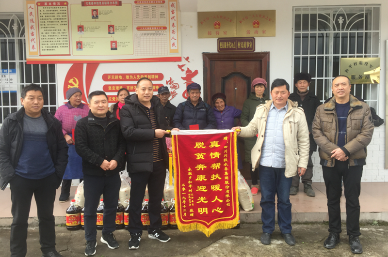 在行駛近6小時車程后,工作組到達(dá)了海拔1500多米的和平村。在和平村政府相關(guān)人員的陪同和村民們熱情的招呼聲下,但書記快步向前與他們一一握手,將帶來的大米、食用油、慰問金等慰問品送到貧困戶手中,并對他們致以新年的祝福。隨后,和平村村支部書記劉文川代表全體村民向川投水務(wù)贈送“真情幫扶暖人心、脫貧奔康迎光明”錦旗,為川投水務(wù)長期以來開展高標(biāo)準(zhǔn)精準(zhǔn)扶貧表示衷心感謝。